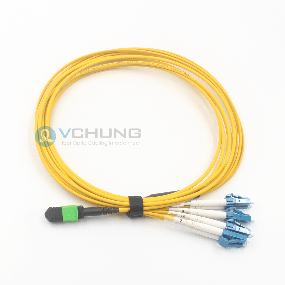 8fibers single-mode MPO-LC fan-out patch-cord usually used for 40G QSFP+ module to 4x10G SFP module, generally use 12 fibers MPO connector on both sides of the four channels for Receive and Transmit signal, that is four channels for Receive signal and other four channels for transmit signal. MPO connector and duplex LC connector are respectively connected with the 40G QSFP+ module and 10G SFP module. Also, 12fibers, 24fibers is available.